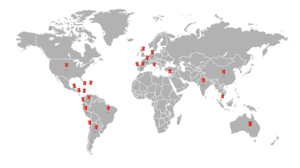 USA · Guatemala · Colombia · Chile · Perú · Ecuador · República Dominicana · Argentina · Jamaica · Costa Rica · Panamá · Brasil · España · Francia · Alemania · Portugal · Inglaterra · China · India · Singapur · Israel · Australia · Italia · Honduras
